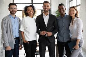 Portrait Of Standing In Row Smiling Diverse Team Posing Differently Looking At Camera. Stock Photo