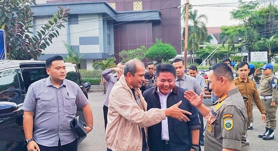 Wakil Gubernur H Cik Ujang menyambut langsung kedatangan Wamen di Bandara Internasional Sultan Mahmud Badaruddin (SMB) II Palembang, selanjutnya Wamenkum RI Edward Omar Sharif Hiariej disambut Gubernur Herman Deru di Kantor Satpol PP Provinsi Sumsel dan Kasat Pol PP Provinsi Sumsel, Maha Resi Tama.