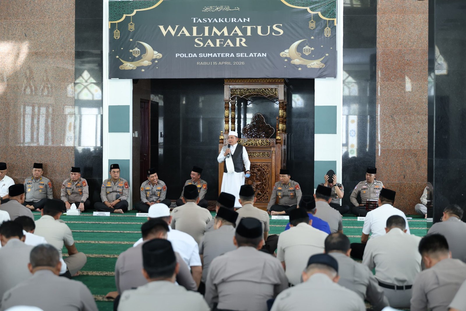 Kapolda Sumatera Selatan Irjen Pol Dr. Sandi Nugroho, S.I.K., S.H., M.Hum. menegaskan bahwa penguatan mental spiritual merupakan fondasi utama dalam membentuk personel Polri yang profesional, berintegritas, dan humanis. Penegasan tersebut disampaikan saat memimpin kegiatan Tasyakuran Walimatussafar bagi keluarga besar Polda Sumsel yang akan menunaikan ibadah haji musim 1447 H / 2026 M di Masjid Assa’adah Mapolda Sumsel, Rabu (15/4/2026).
