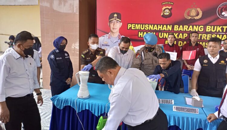Pemusnahan terhadap barang bukti sabu yang berwarna bening dan biru ini ini dilakukan dengan cara memblender dan memasukkan cairan pembersih kamar mandi agar tak bisa lagi digunakan.