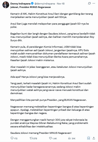 JAKARTA, RakyatRepublika – Pakar Hukum Tata Negara, Prof Denny Indrayana menyinggung persoalan dugaan ijazah Joko Widodo