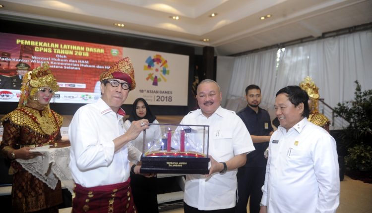 PALEMBANG, rakyatrepublika.com-Menteri Hukum dan HAM Republik Indonesia Yasonna H Laoly memberikan pembekalan orientasi kepada Calon Pegawai Negeri Sipil (CPNS) Kantor Wilayah Kementerian Hukum dan HAM Sumatera Selatan dan Bangka Belitung di Griya Agung Rabu (18/4/2018).